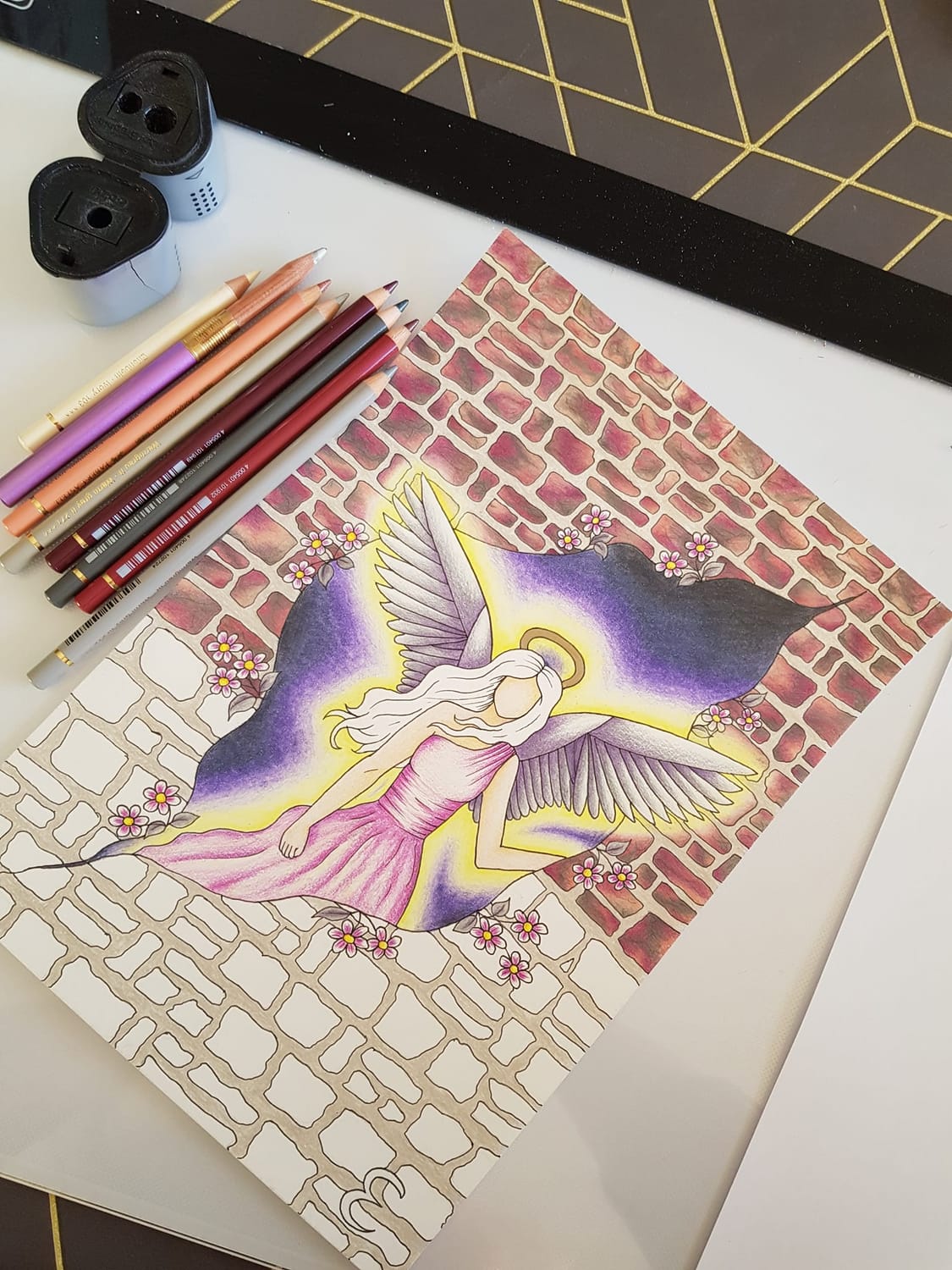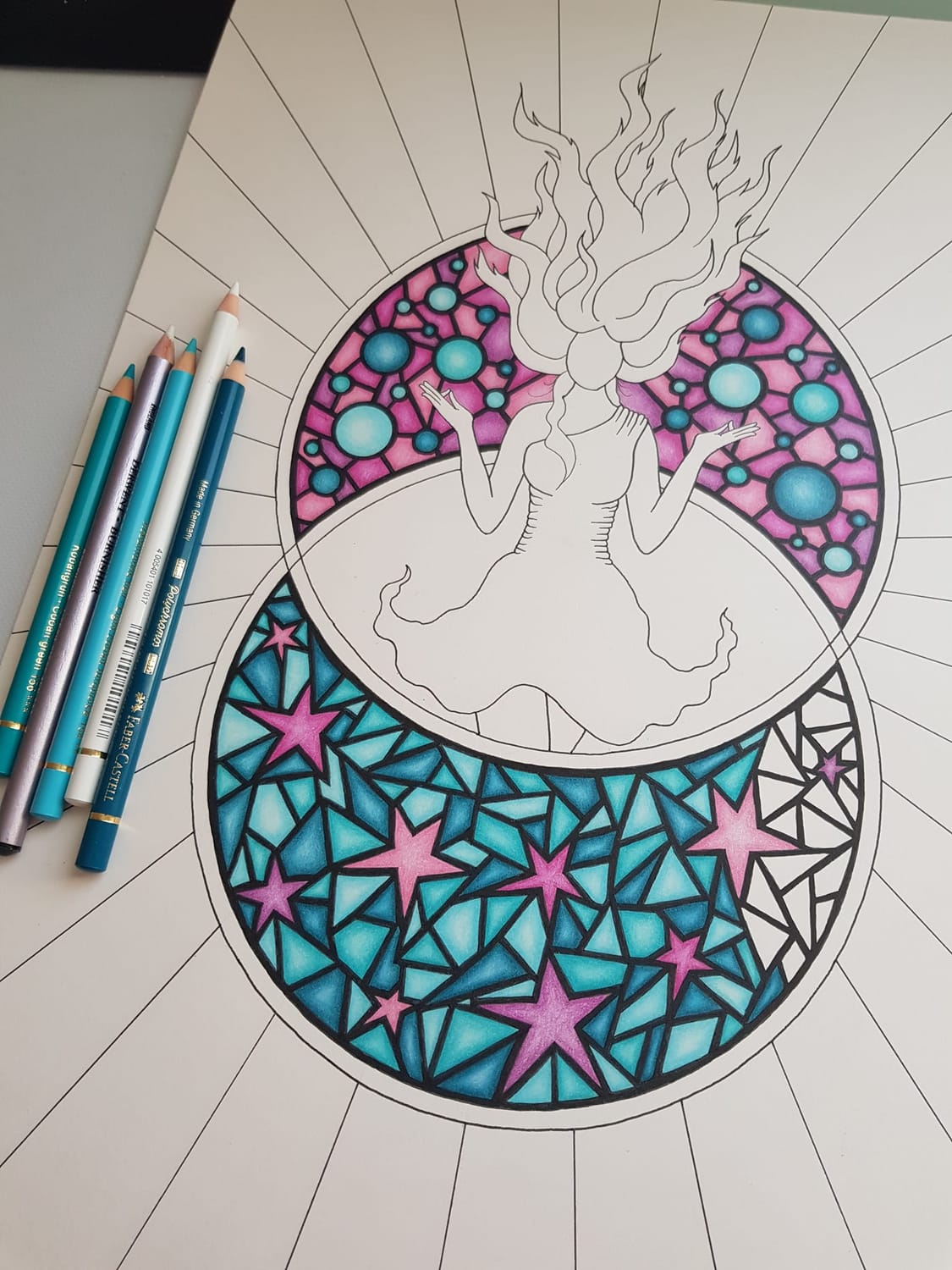 🔍 Et c’est là que j’ai réalisé quelque chose d’important : mes dessins étaient tous différents. Certains aux crayons de couleur, d’autres aux feutres à alcool, d’autres encore en peinture acrylique. Des personnages, des paysages ou de la géométrie sacrée… Un mélange que je jugeais avant “trop fouillis”, “pas assez cohérent”, “pas assez parfait”.