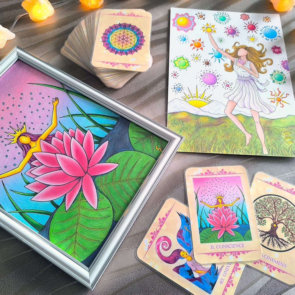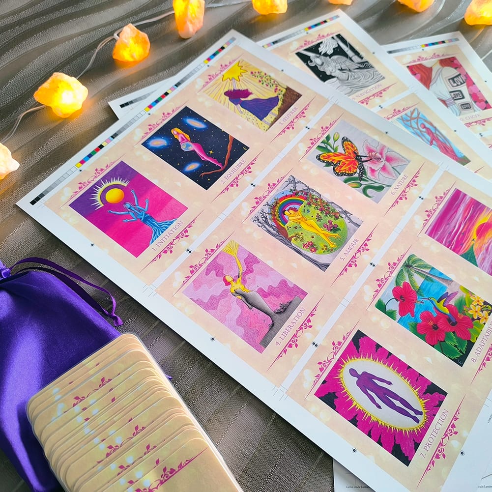 ✂️ Quelques jours plus tard, j’ai imprimé, découpé et plastifié les cartes : le prototype de l’Oracle Lumière était né. Je l’ai testé sur moi‑même, puis sur mes proches. C’était comme si l’oracle m’apprenait “sa façon de fonctionner”. Je me suis sentie guidée et accompagnée à chaque étape.